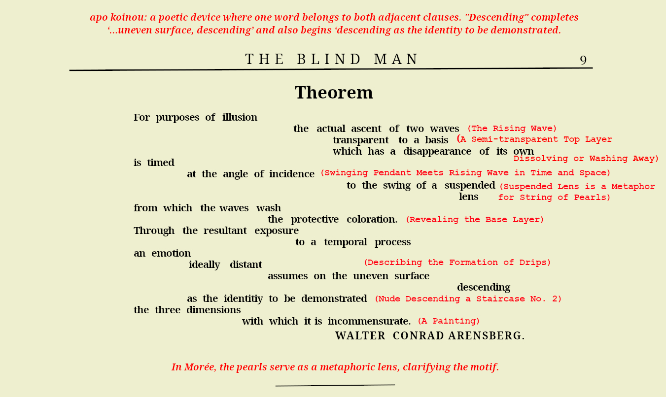 Walter Arensberg’s poem Theorem (1917) appears to describe Morée directly, while also alluding to the